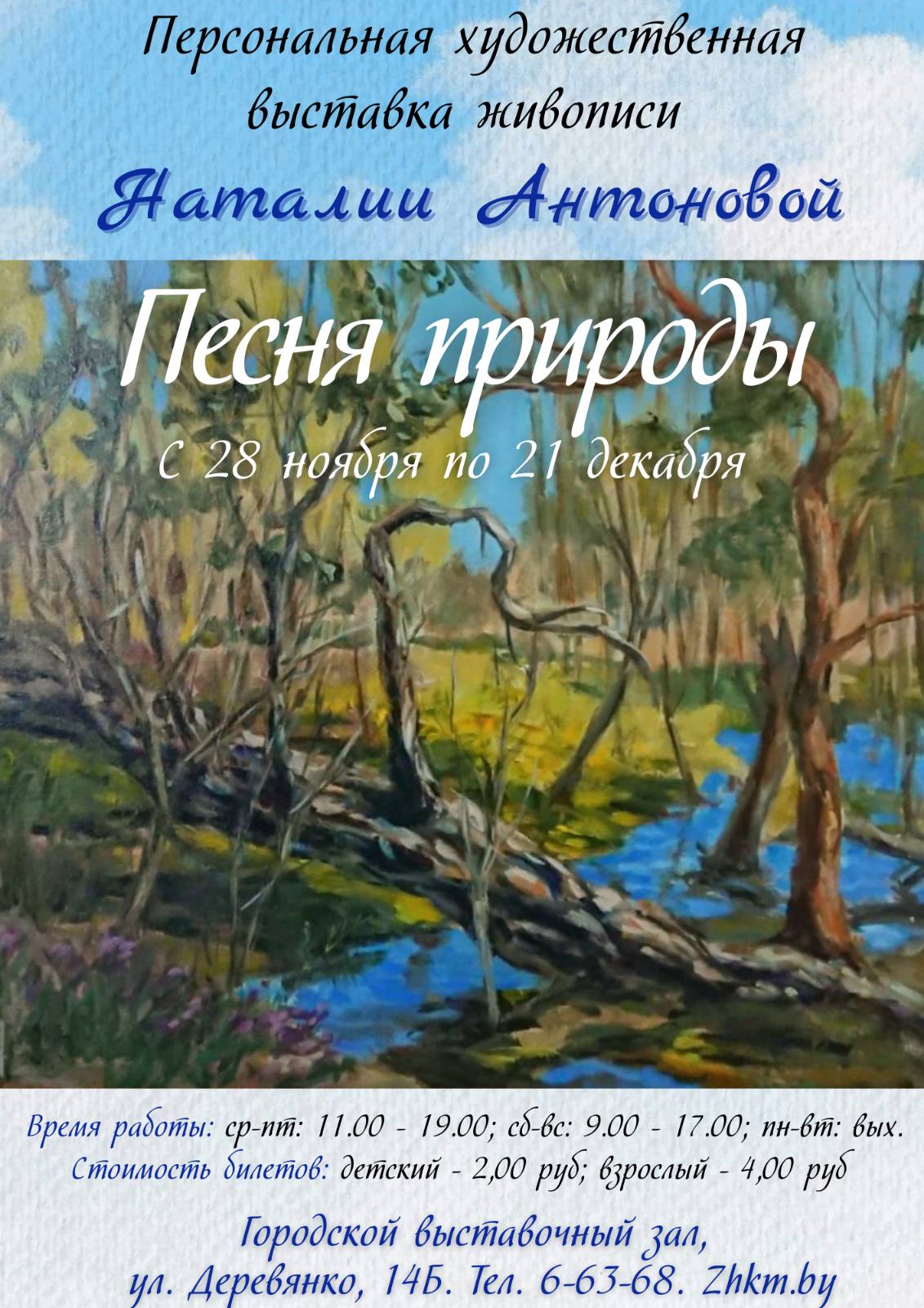 Персональная выставка художницы-любительницы Натальи Антоновой "Песня природы" (Гарадская выставачная зала (вялікая), вул. Дзеравянкі, 14б).
