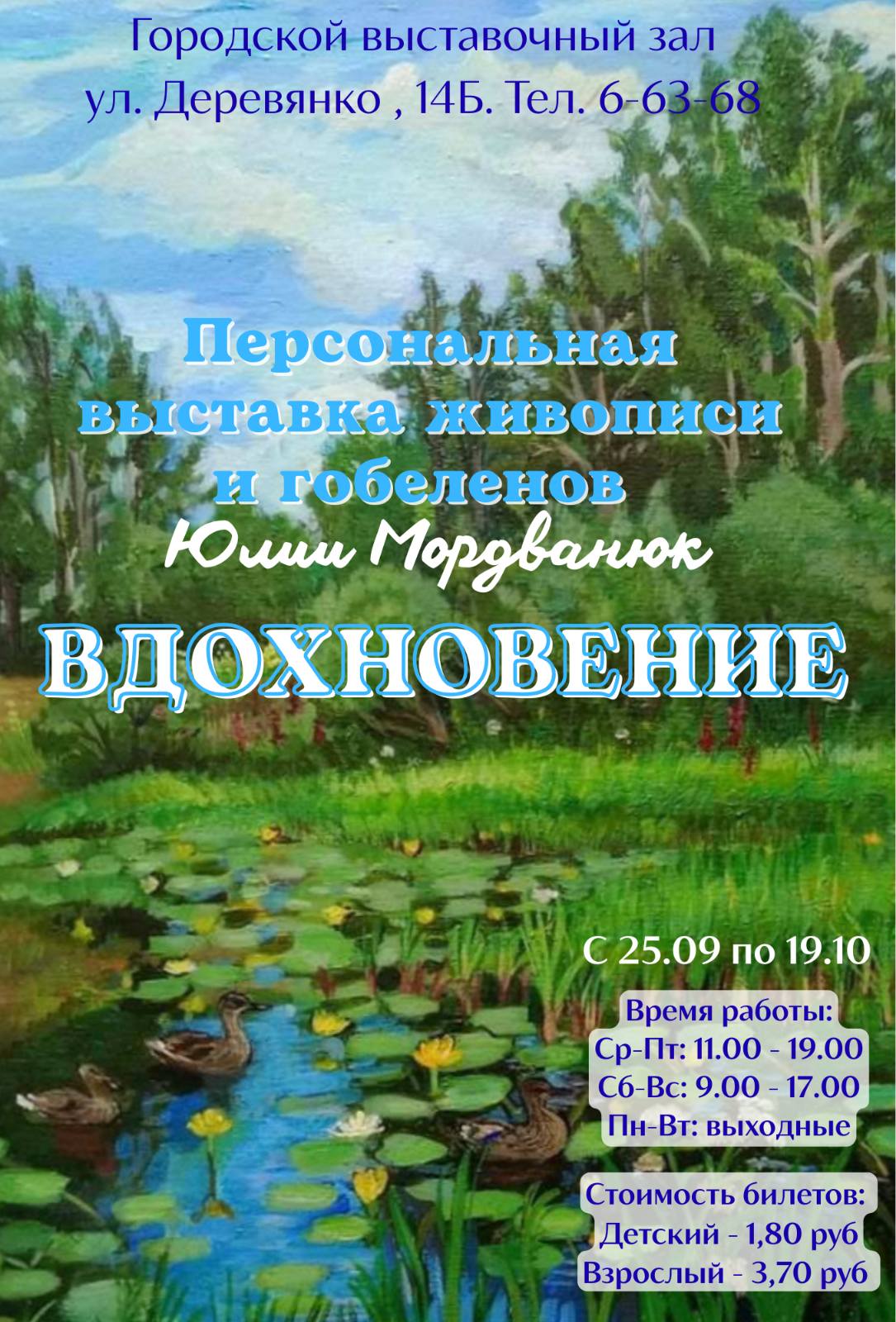 Уважаемые посетители! С 25 сентября по 19 октября В Городском выставочном зале пройдёт персональная выставка живописи и гобеленов Юлии Мордванюк "Вдохновение".