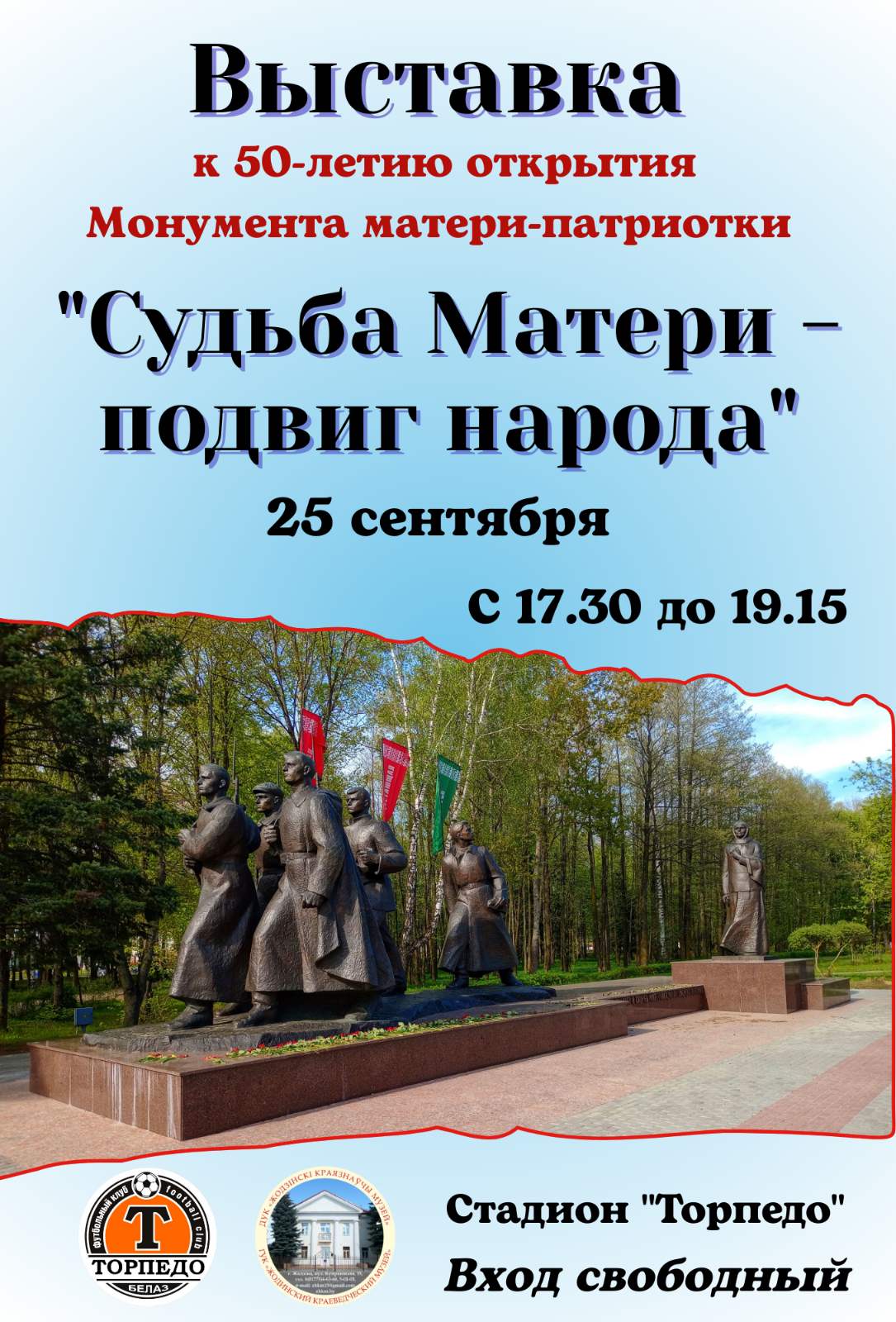 Дорогие жодинцы и гости нашего города! 25 сентября на стадионе "Торпедо" вы сможете увидеть выставку "Судьба Матери - подвиг народа", посвященную 50-летию Монумента в честь советской матери-патриотки, открытого 29 августа 1975 года.